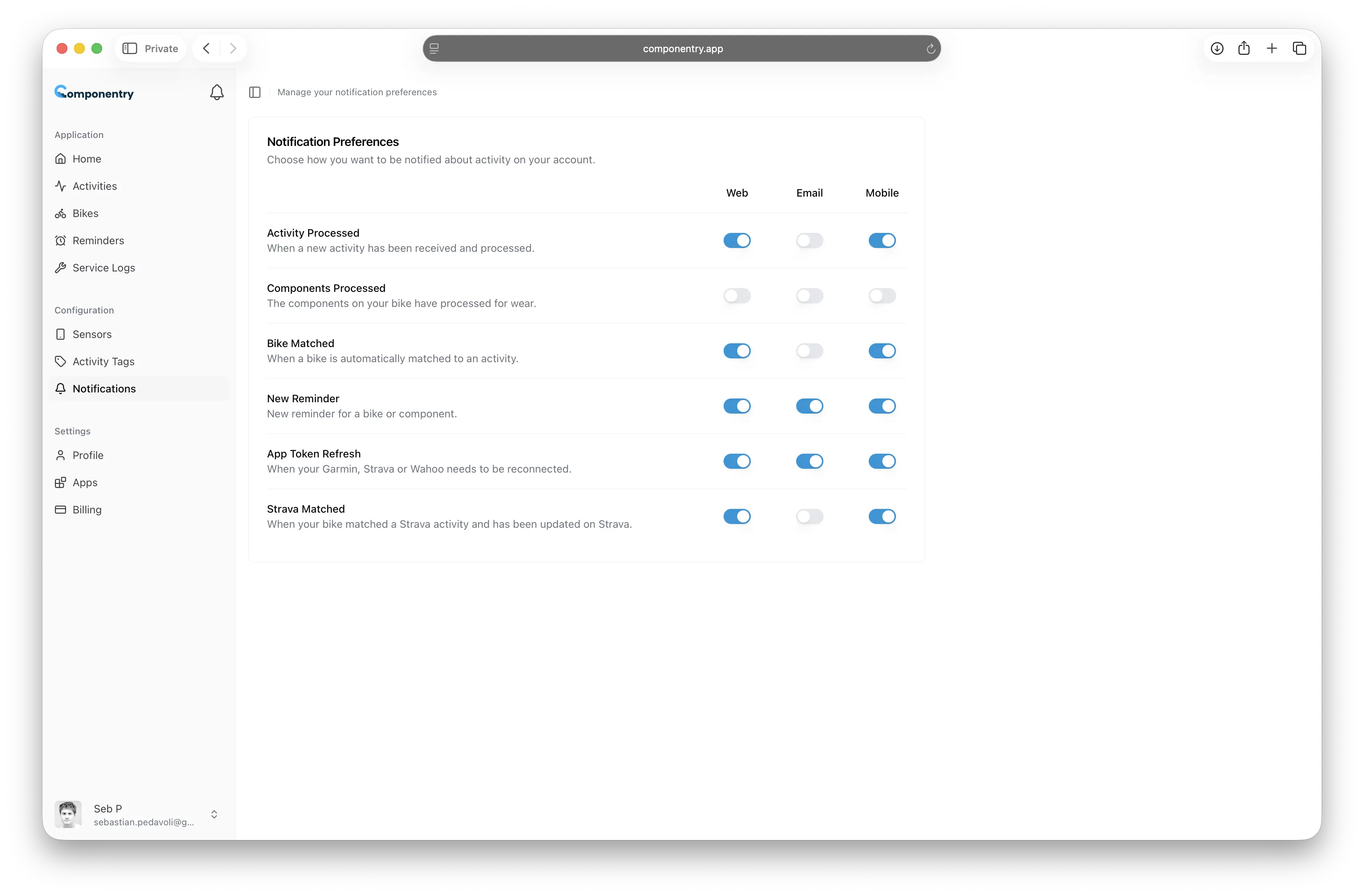 Componentry gives you complete control over your notifications. This guide walks you through accessing the notification settings and configuring each notification type for your preferred channels.